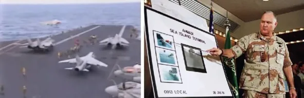 Буря в пустыне, слева авианосец США, справа командующий генерал Шварцкопф, кинохроника 17.01.1991.