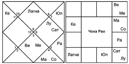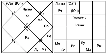 4. Гороскоп 4 очень похож на гороскоп 3, где управители 9-го и 8-го домов снова обмениваются домами. Это гороскоп индуистского брахмана, серьезно занимающегося буддийской садханой после знакомства с японским гуру.
