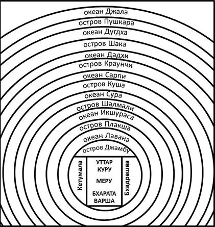 Парашара: «Ты, Майтрейя, услышишь от меня краткое описание земли, так как для подробного ее описания мне не хватило бы и века. Семь главных континентальных островов – это Джамбу, Плакша, Шалмали, Куса, Краунча, Шака и Пушкра. Они окружены семя великими морями: море соленой воды (Лавана), море сока сахарного тростника (Икшу), море вина (Сура), море очищенного масла (Сарпи), море простокваши (йогурта) (Дадхи), море молока (Дугдха) и море пресной воды (Джала)».