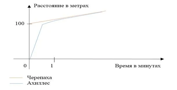 Во время старта Ахиллес находится на стартовой линии, в то время как черепаха – на 100 метров впереди от него. После старта Ахилес пытается догнать черепаху. Утверждают, что если применить следующий способ мышления, то невозможно доказать, что Ахилес способен догнать черепаху. Последовательность мыслей строится следующим образом: когда Ахиллес прибегает в то место, где была черепаха, она в этот момент уже находится немного дальше, через какое-то время он снова прибегает туда, где до этого была черепаха, она снова уже немного дальше. Размышляя таким образом, мы убеждаемся, что Ахилес будет все больше и больше приближаться к черепахе, но совсем догнать, а уж тем более перегнать ее он никогда не сможет. Если представить данную ситуацию в математике в виде графика, то мы получим линию, которая стремится максимально приблизиться к границе, случай практически для конвергенции. Таким образом якобы видно, что посредством такого образа мышления невозможно доказать, что Ахиллес догонит черепаху. Однако, если мы, любезный читатель, попробуем проделать это на практике, в виде эксперимента, то мы сразу увидим, что Ахиллес все же догонит черепаху!