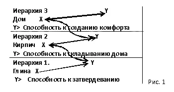 На рисунке наглядно показано, что У-Идея (У→) предыдущей иерархии (неотделимая от массы, но уже не то, что по отдельности) становится Х-массой новой иерархии способной воплотиться в новую Y-Идею. Так, для того, чтобы кирпич держал свою форму (идею) он должен быть изготовлен только из подходящего состава, иначе в какой-то момент схема даст сбой.
