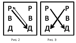 На рисунке 2 слева первый субъект диалога, справа второй субъект. Это могут быть люди, идеи, идеологии, философские модели. Конфликта нет. Линии взаимодействия параллельны. Но, если оппонент тоже встаёт в позу «Р» – Родителя и повелевания и желает, чтобы ТОТ оказался в роли Дитя, см. рис. 3, то возникает конфликт. На рисунке видны пересекающиеся стрелки неудовлетворённых амбиций. Их интересы не совпали, а пересеклись. На обоих рисунках показана конфликтная ситуация, только на одном из них произошло подчинение, а на другом конфликт.
