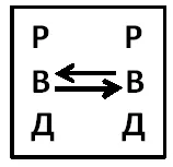 Вступая во взаимодействие с другим, повелевающий человек выступает изначально с возвышенной точки «Р», как бы глядя на оппонента сверху, заставляя его встать в позицию «Д» – дитя, подчинение. Если оппонент идёт у него на поводу или в силу слабости занимает позицию «Д», то конфликта не происходит. «Да, я виноват, и подчиняюсь», – как бы говорит «Д». Смотреть рисунок