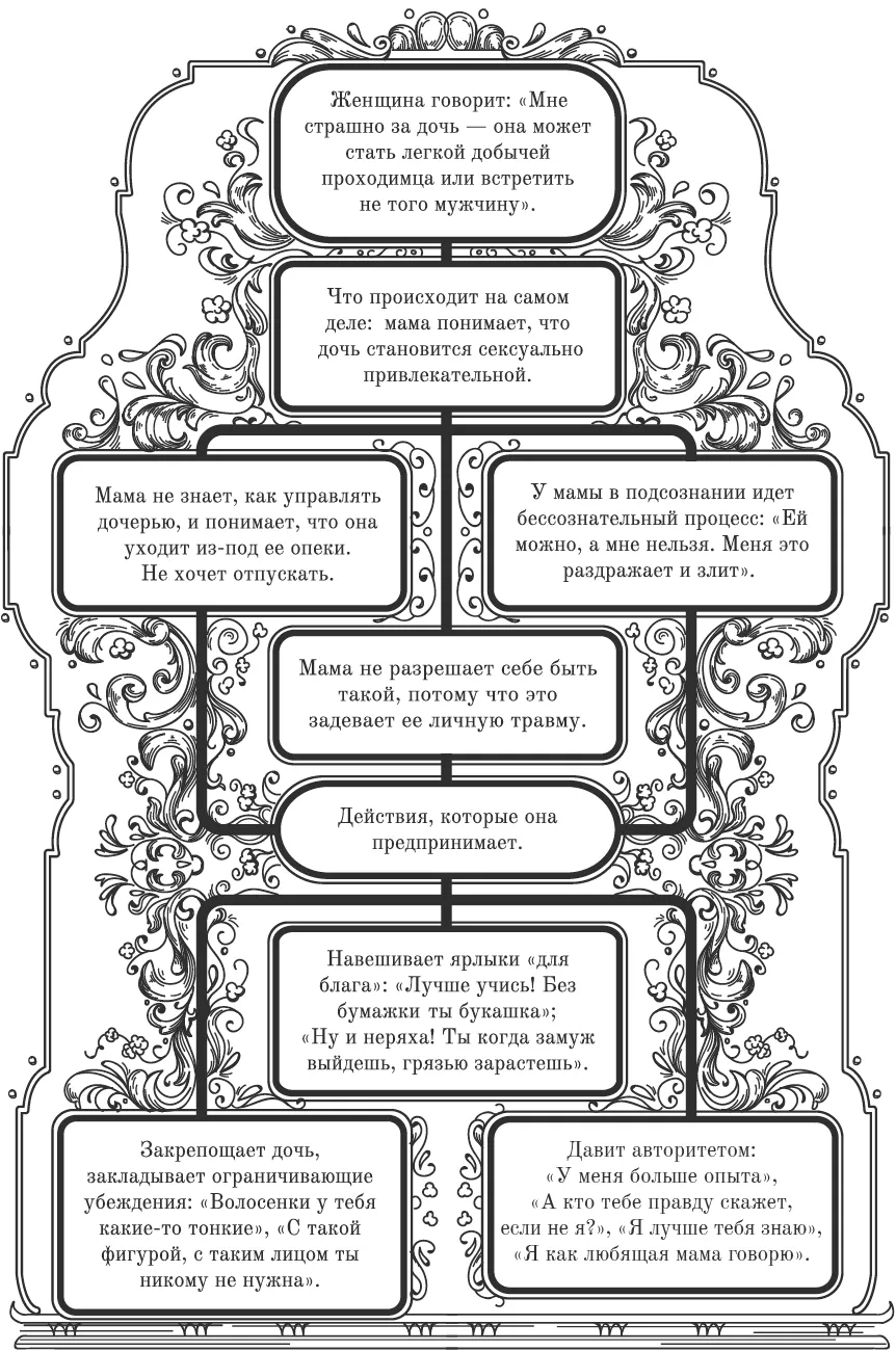 Ситуация, описанная в схеме, показывает, как, скрываясь за благими намерениями, прорисовывая границы сексуальности для девочки, мама порой способна уязвить ее, сама того не желая. Она ожидает, что такой манерой воспитания оградит дочь от пошлости, распущенности, но перегибает и навязывает комплексы, не оставляя ни единого шанса природной раскрепощенности, живости, естественности.
