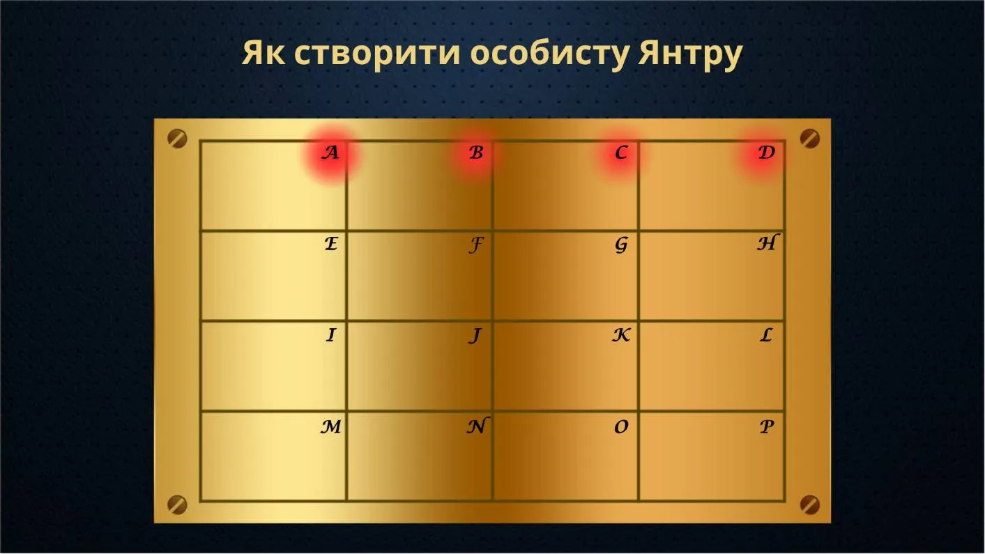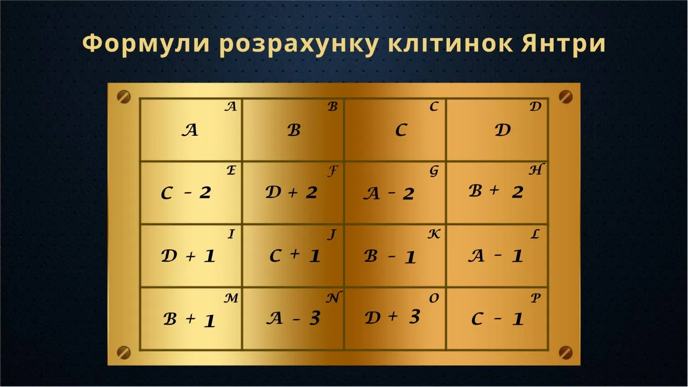 Перший ряд цього квадрата – вихідні числа Янтри, де: А – місяць народження людини