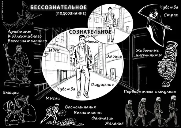 На рисунке, находящемся в этой главе, схематично изображено типичное содержимое Сознания (освещенная часть) и сравнительно небольшая часть Бессознательного (затемненная часть).