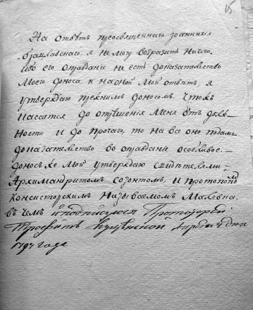 Итак, мы видим, что отец Трофим обвинял архиерея в очень серьезном по тем временам преступлении – оскорблении Государя (как так: Государь – и «немилостивый»?), а также в растрате 20 000 рублей казенных денег, выделенных на помощь духовенству, обращавшему униатов. Владыка Иоанникий, отрицая эти обвинения, сам указал на взяточничество отца Трофима с «присоединяющихся от унии» и что священник хотел без согласи я на то Иоанникия просить Государя о награде за такое миссионерство.