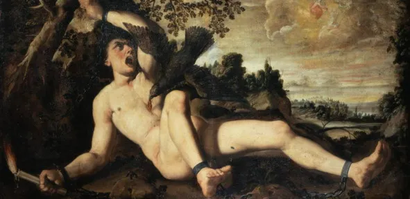 А Зевс, сука, приказал его за это своим подручным – Власти и Силе приковать к скале на Кавказе (то есть Кавказ – это волне обычное место заключения, где власть и сила изолировали отморозков от порядочного общества), да ещё издевался гада, подсылал к нему каждый день своего подручного «орла», печень клевать (напомню, согласно «библейской» традиции принято считать что Иесус был убит ударом копья в печень), но слава богу печень у Прометея каждый раз отрастала (нихер-ра-се парняга бухал распятый, печень пёрла недуром), вот страдалец-то, чуть подальше глянете как он мается на картине итальянского художника…