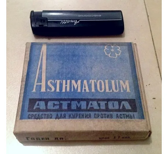 Какая интересная информация. До 70х годов сигареты с различными лечебными составами с различными лечебными составами в СССР и по всему миру. На картинке изображены сигареты в состав смеси которой входит белена черная и дурман трава, как лекарство от бронхиальной астмы (без побочных эффектов). А в 90е буржуи запустили и разрекламировали дешевые в производстве таблетки с кучей побочных эффектов, чтобы наживаться на нашем здоровье.
