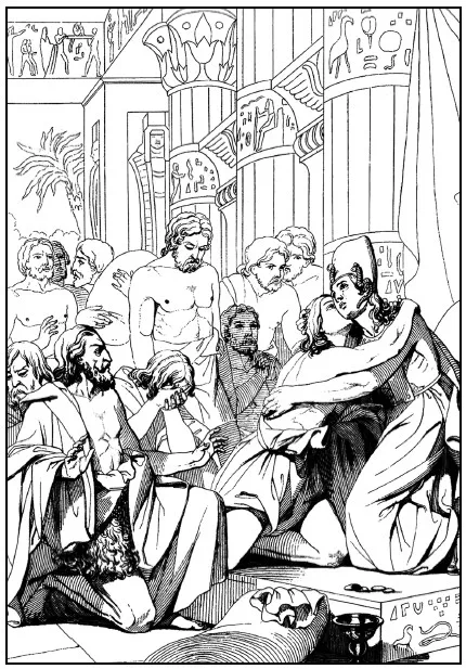 Тогда Иуда сказал Иосифу: «Господин наш! Отец наш стар, и этого сына он особенно любит; я поручился привезти его в целости назад; пусть лучше я останусь рабом у тебя вместо него, а его отпусти с братьями к отцу; иначе отец наш умрет с горя». Иосиф не мог более удержаться, выслал всех слуг из комнаты, заплакал и сказал братьям: «Ведь я Иосиф, брат ваш, которого вы продали в Египет». Братья увидели, что действительно это он, смутились и ничего не могли ответить. Но Иосиф сказал им: «Не печальтесь теперь и не жалейте о том, что вы продали меня сюда; потому что это Бог устроил так для сохранения вашей жизни». При этом он добавил, чтобы они отправлялись скорее домой, рассказали все отцу и вместе с ним переселялись в Египет, потому что два голодных года прошли, а еще остается пять лет. И потом стал он, плача от радости, обнимать и целовать Вениамина и остальных братьев. Отец очень обрадовался, когда узнал, что Иосиф жив, и притом в такой славе у египтян. Он переселился вместе с детьми и внуками в Египет к Иосифу. Иосиф с радостью встретил отца своего, Иакова, поселил его со всем семейством в самой плодородной Гесемской местности и заботился об отце и братьях до самой их смерти.