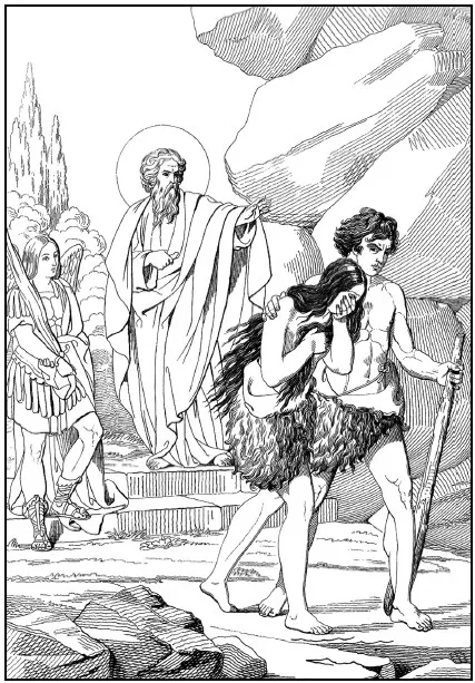 О древе же познания добра и зла Бог сказал Адаму и Еве, чтобы они не вкушали плодов этого дерева, а если вкусят, то умрут. Но диавол прельстил их нарушить эту заповедь Божию, потому что завидовал их блаженству и желал, чтобы люди, подобно ему, лишились своего блаженства и сделались злыми и непокорными Богу. Он вошел в змия и стал уверять Еву, что Бог неправду сказал, будто они помрут, если вкусят от плодов древа познания добра и зла, напротив: если вкусят, то сами будут как боги, знающие добро и зло. Ева поверила. К тому же плоды были прекрасны на вид. Она взяла их и ела, а потом уговорила Адама, и он ел. Когда Бог явился обличить их в грехе, они, вместо раскаяния, стали слагать свою вину на других. Адам сказал, что жена, данная ему Богом, соблазнила его, а Ева сказала, что змей обольстил ее. Бог положил им наказание, сказав Адаму, что он в поте лица будет добывать себе хлеб, пока не умрет, а Еве, что она в болезнях будет рожать детей, и изгнал их из рая. Лишась прежнего блаженства и счастья, они должны были потом с трудом зарабатывать себе пищу, их постигли разные другие неприятности, болезни и, наконец, смерть. А диаволу, как главному виновнику зла, Бог сказал, что Семя жены сотрет ему голову. Это значило, что родится Спаситель от Девы, Который победит диавола. При входе же в рай был поставлен Херувим с пламенным мечом, чтобы охранять путь к дереву жизни.