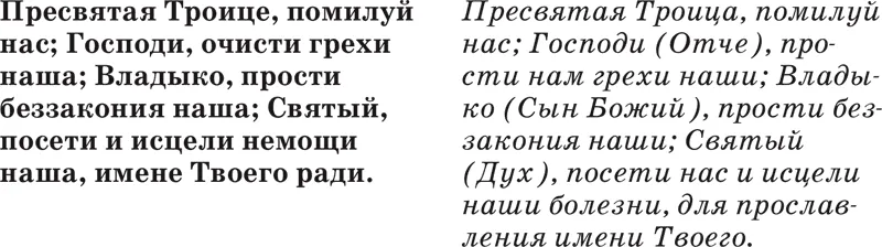 Молитва эта – просительная. В ней мы обращаемся сначала ко всем трем Лицам вместе, а потом к каждому Лицу Троицы отдельно: к Богу Отцу, чтобы Он очистил грехи наши; к Богу Сыну, чтобы Он простил беззакония наши; к Богу Духу Святому, чтобы Он посетил и исцелил немощи наши.
