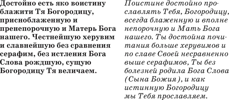 Вэтой молитве мы восхваляем Богородицу, как Мать Бога нашего, всегда блаженную и вполне непорочную, и величаем Ее, говоря, что Она Своею честью (честнейшую) и славою (славнейшую) превосходит самых высших ангелов: херувимов и серафимов, то есть Божия Матерь по своим совершенствам стоит выше всех – не только людей, но и святых ангелов. Она без болезней, чудесным образом от Духа Святого родила Иисуса Христа, Который, ставши от Нее человеком, есть в то же время Сын Божий, сошедший с небес, а потому Она есть истинная Богородица.