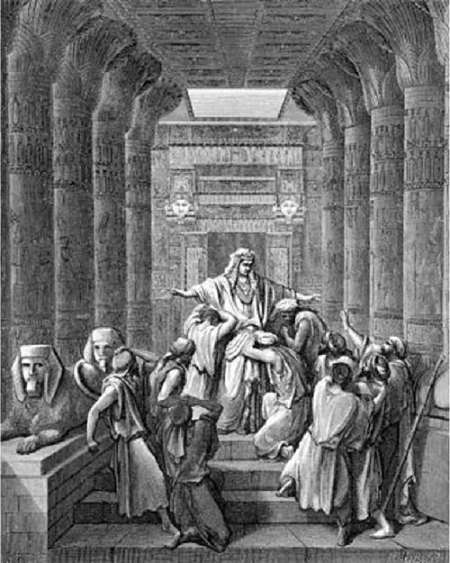 Но Иосиф продолжал: «Не бойтесь! Сам Бог привел меня сюда, для сохранения вашей жизни. Отправляйтесь скорее к отцу и скажите ему, чтобы он ехал в Египет ко мне, потому что еще остается пять лет голода». Потом стал он обнимать и целовать Вениамина и всех братьев и плакал, обнимая их.