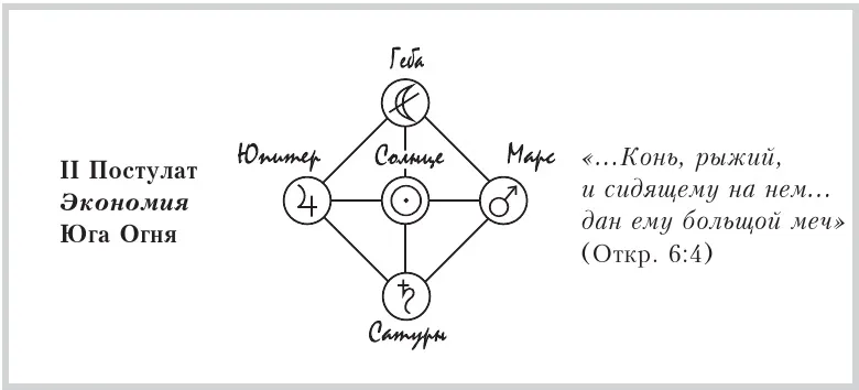 Итак, II Постулат, Экономия, ограничивает потребление энергии и одновременно регламентирует ее количество. Юга Огня, отражая и утверждая Принцип Экономии в отношении идущих по Пути Познания, дает представление о способе исполнения этого Постулата в лице огненного всадника Апокалипсиса: «…дано взять мир с земли, и чтобы убивали друг друга…» (Откр. 6:4).