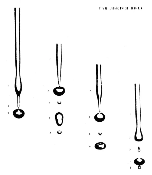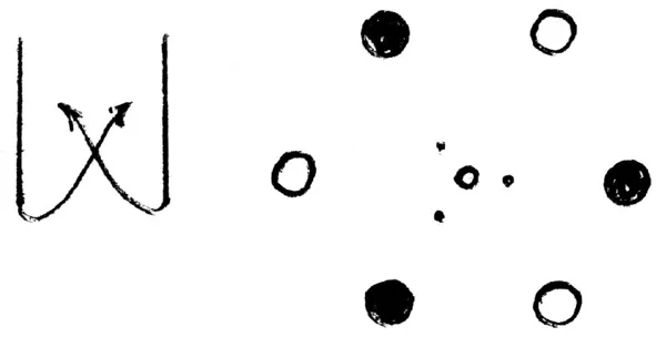 Так образуется шестерка крупных звезд. А из маленькой капельки при падении выворачивается небольшое колечко, из которого образуется три еще меньших звездочки. Из центральной части маленькой капли выворачивается остаток вещества, который мал, чтобы образовать кольцо и разделиться на три части, но больше, чем одна маленькая звездочка – это и есть Солнце. Образуется фигура типа конуса. Шесть конусов, один возле другого или один в другом, образуют баранок (снежинку).