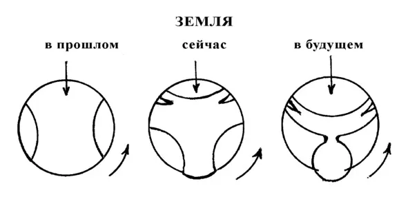 Затем все тяжелые элементы соберутся в недрах Земли. Из воздуха и воды уйдут молекулы металлов, которые являются сейчас ядрами конденсации и испарения. Затихнут ветры, остановятся течения, закончатся круговороты веществ. Скорость вращения Земли вокруг Солнца станет огромной, сутки станут короткими. Антарктида оторвется от Земли. В молекулах воды порвутся связи между кислородом и водородом, произойдет взрыв, и Антарктида, как ракета, пойдет вокруг Земли под углом 90° к орбите Луны. А земная кора, как чулок, соскользнет в пустую чашу Ледовитого океана. Земля вывернется наизнанку. У нее появится третий спутник.