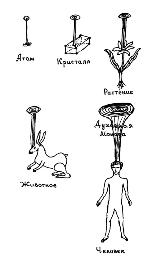 Рисунок 4 поясняет сказанное через связь с Высшей Эволюцией. На самом деле развивается высшая душа всего существующего, это Духовная Монада. Она развивается, посылая свой духовный Луч – Нить Сутратмы в более плотные миры. Вокруг Луча и формируются различные тела по мере освоения опыта жизни в плотных мирах. Расширяя опыт, Монада на основе полученного привлекает новые духовные энергии для новых воплощений и эволюционных задач, начиная с мельчайших частиц, например, с атома. Всякий раз обогащённая Монада формирует в плотных мирах уже новую более сложную форму, воплощая при этом Луч большей мощности.