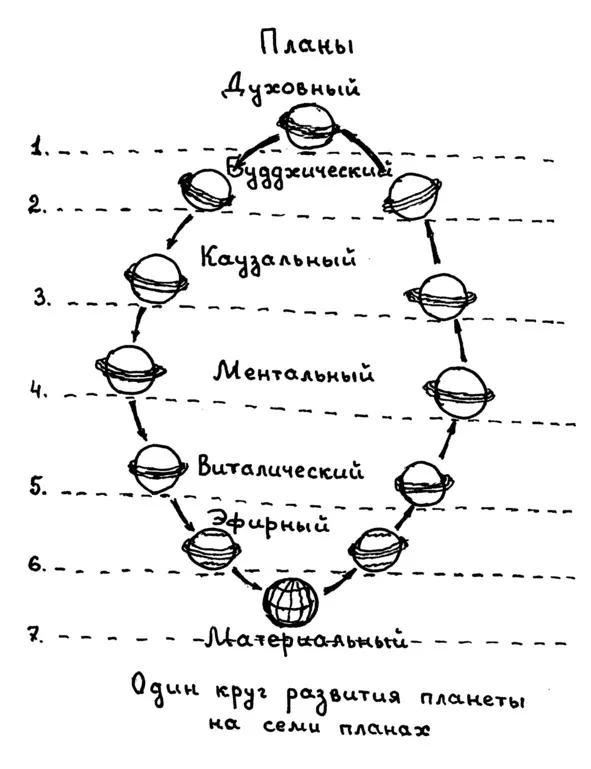 Земля, как мы привыкли её видеть, представляет лишь 1/7-ю часть – физическую. В планетарной цепи она должна совершить 7 циклов или 7 кругов развития (см. рис.3), которые в сумме называются Махаманвантарой. Сейчас совершается уже 4-й круг, то есть уже в 4-й раз Земля воплощается на материальном плане, как сообщает Анни Безант.