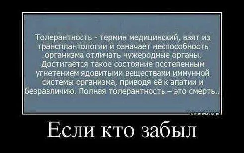 Нельзя представлять толерантность абсолютной ценностью. Сама по себе толерантность может быть опасной и вредной “вещью”. В медицине с ней борются, потому что толерантность для живого организма – снижение, потеря иммунитета и, в конечном счете, смерть.
