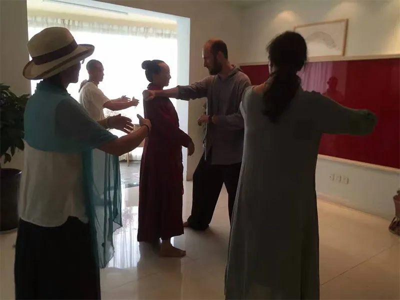 В первой группе учеников было всего восемь. Обучал их даосскому искусству культивации жизненности (ян-шэн, 养生); методам работы с телом, энергией-ци и духом-шень. На фото объясняю принципы внутренних циркуляций в теле.
