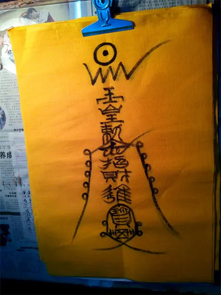 Также судьба сегодня подарила встречу с одним фан-ши как раз в момент одухотворения им амулета-фу (神符). Себя он строго-настрого запретил фотографировать, но вот написанный им амулет (но ещё не одухотворённый) запечатлеть разрешил. Это цюцай-фу (求财符), привлекающий богатство.