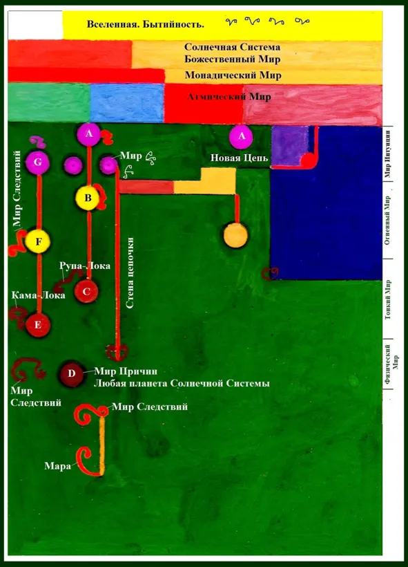 На изображении 4. приведены термины: Мир Буддхический14, Огненный Мир15, Тонкий Мир16, Плотный (Физический) Мир17 и Астральный Свет.