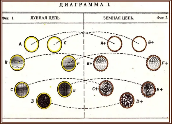 В Природе Солнечной системы Земли ещё не было, но Луна свой жизненный период уже заканчивала. В продолжении бесчисленных веков Жизнь на лунной цепи прошла через Семь Больших Кругов от сфер-оболочек А до G и семь малых кругов на самих сферах-оболочках.
