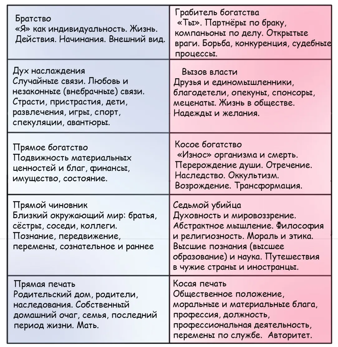 Дворец Жизни – образ фундамента, места, на котором располагается жизнь человека и его судьбы. «Бюджет» организма: здоровье; болезни, инвалидность, труд, деятельность, нетрудоспособность, прислуга, доходы, кредиты, долги, привычки, любимые животные.