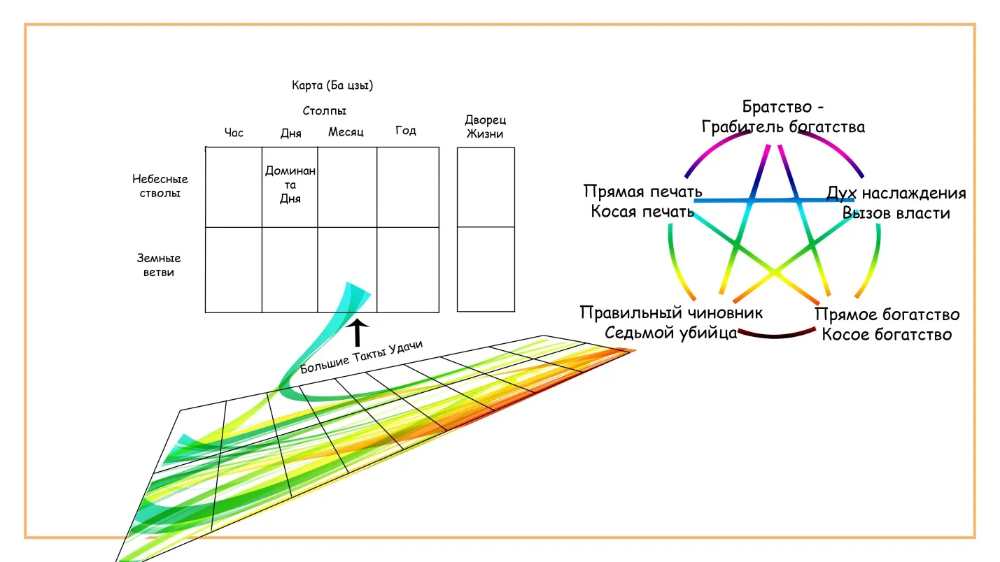 Китайский гороскоп состоит из трех составляющих: карта (дата рождения личности и его час рождения), такты удачи и индивидуальный круг У-Син с 10 божествами относительно личной небесной стихии человека (Доминанта дня, господин дня или НС дня).