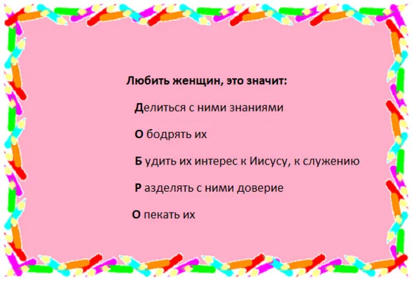 – Не создавай атмосферы подавленности, тягости в служении Господу, а наоборот радости и полноты в скорбях и переживаниях, помня о том, что у Господа всегда есть надежда для нас. Не надо «председательствовать» на всех собраниях, встречах. Создание хорошей, рабочей, творческой атмосферы – это один из важных составляющих встреч. Не доминируй на встречах, а задавай общие направления. Ведь мы собираемся «во Имя Его». Собираться во Имя Иисуса означает относиться к другим людям с духом служения, почитания и радости, характерного для взаимоотношений Иисуса в Троице.