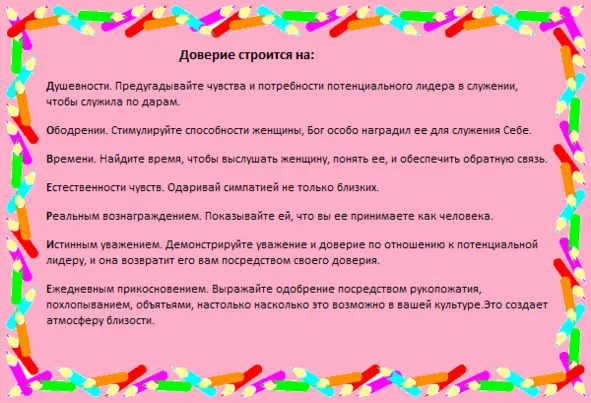 Открытость и искренность, доверие подругам своих «тайн», если этого нет, то это жизнь на расстоянии от других людей. Скорее всего, вы не знаете, друг друга, и не пытаетесь этого сделать. Только испытанным верным друзьям обычно доверяют сокровенные тайны. Иисус был полностью открытым, Он не препятствовал друзьям видеть Его в моменты радости, печали, слез, усталости. И говорил об этом: « душа Моя скорбит смертельно». (Мф.26:37). Иисус был открыт перед своими друзьями. А как с этим обстоит дело у тебя, дорогая сестра? Не может быть любви без полного знания друг друга. Но есть в общении предупредительные знаки, когда стоит притормозить. Женщина переводит разговор в другое русло, и тебе надо увидеть, что она закрыта к этой теме. Или начинаются отшучивания, или смех над тем, кто открылся. Оценочные суждения, или скорые советы, или даже позиция, что ко мне это не имеет никакого отношения, и начинается осуждение, и проявление бесчувственности. И умение хранить маленькие тайны, это тоже нужно воспитывать в себе. Когда мы не рискуем быть откровенными, отношения умирают. Поэтому в команде нужен хотя бы минимальный уровень рискованной открытости и честности, для этого так мало нужно, всего лишь доверять друг другу.