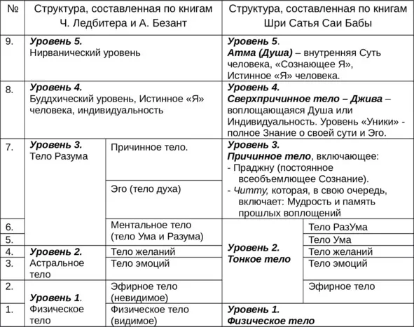 Уровень 3 структуры в правой и левой части таблицы 4.1 совершенно не совпадают. Каждое новое тело человека – это одежда для пребывания в той или иной зоне Вселенной. Это – спецкомбинезон для эффективного восприятия реальности именно этой зоны. В этом комбинезоне не должно быть ничего лишнего, не свойственного данному Пространству. Этому требованию не отвечает предложенный Анни Безант состав «тела разума», в которое входят Ум, Разум, Эго и Причинное тело. Дело в том, что Причинное тело – это «одежда Мира Пустоты». К моменту вхождения в эту зону Ума уже не было в помине, а Разум растворился на пороге этой зоны в Мудрости. Нет в Пустоте ни Ума, ни Разума, – там функционирует Мудрость. Причинное тело в структуре человека должно быть выделено так, как это сделано в правой части таблицы 4.1.