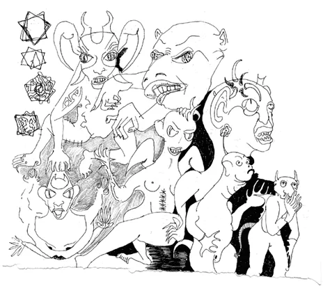 Девушка в белом – одна из унси или посвящённых в таинства храма, шагнула в дворик из темноты и, кивнув в обе стороны, зажгла свечу, поставив её на землю. Жрица или мамбо, повторив телодвижения девицы, вынесла чашу с кукурузной мукой, изобразив с её помощью какой-то каббалистический символ на земле52. Это, пояснил Бовуар, веве – эмблема лоа, то есть демона, вызываемого в данный момент. Затем мамбо плеснула водой на четыре стороны света, не забыв оросить центральную колонну дворика, через которую духам предстоит войти в этот мир. Потом водой оросили три барабана и порог храма. Покончив с водными процедурами, мамбо обвела посвящённых против часовой стрелки вокруг пото митана53 – центрального столба. Процедура завершилась коллективным коленопреклонением перед верховным жрецом.