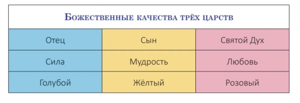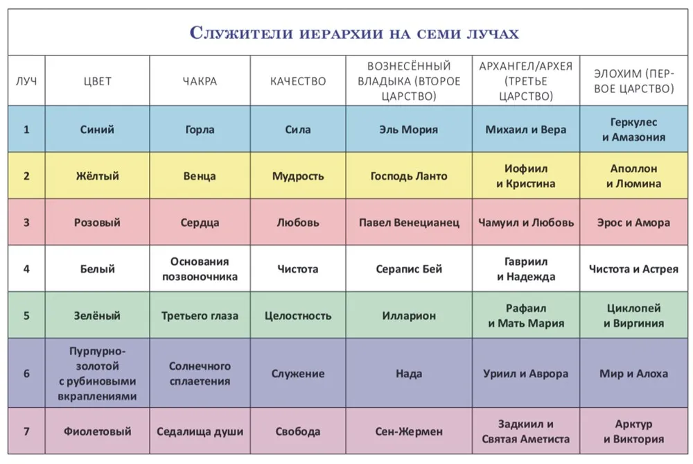 Таблица «Служители иерархии на семи лучах» (см. следующий раздел) содержит имена иерархов, служащих на семи лучах в каждом из трёх царств. В первых четырёх колонках представлена основная информация о семи лучах. В пятой перечислены имена семи чоханов лучей. А в шестой приведены имена семи архангелов, работающих на каждом из лучей, а также их близнецовых пламён, или женских дополнений, называемых «археями». Последняя колонка содержит имена семи могущественных Элохим и их Божественных дополнений.