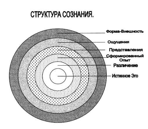 Рассмотрим то же самое в обратном порядке. То, что дает нам сознание – это частица божественного духа, которая перерождается в разных мирах из жизни в жизнь. В человеке начинает формироваться сознающая душа, которая является индивидуальной эволюционирующей частицей, она приобретает опыт в своих перерождениях, также мы имеем внешнюю личность, формирующуюся на основе приобретенного опыта в этом материальном мире, на основе этого опыта у нас формируются представления и фиксированные идеи. Дальше у нас имеются ощущения, органы чувств, с которыми мы часто себя отождествляем, и, наконец, форма-внешность, или наше тело, без которого мы себя не представляем. В обычной жизни люди отождествляют себя со всеми этими наслоениями, живут в них. Все, что требуется для достижения истинного сознания – это отождествиться с ним, откинув внешние оболочки. На самом деле, это не так просто сделать.