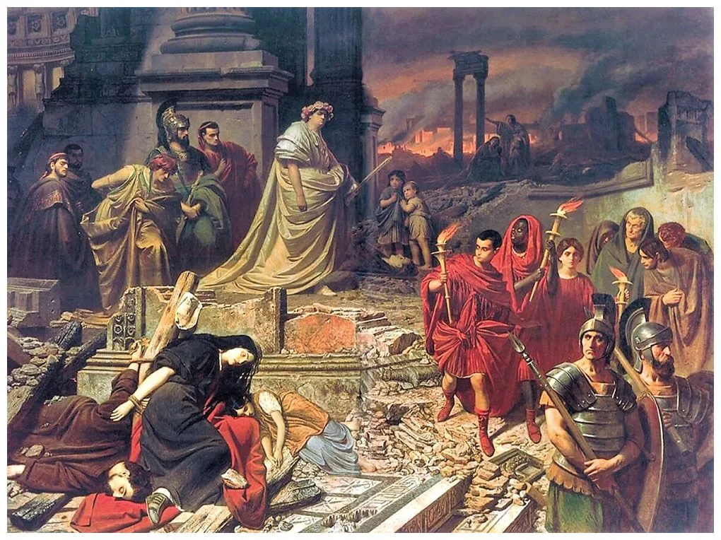 Великий пожар в Риме. Карл Теодор фон Пилоти (ок. 1861). Нерон перед развалинами охваченного пламенем города