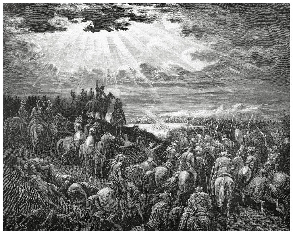 Библейский эпизод, в котором Иисус Навин останавливает Солнце над Гаваоном. Гюстав Доре
