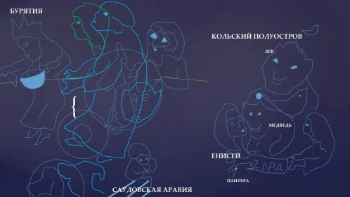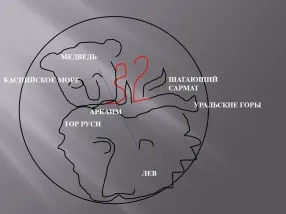 Посмотрите на любую карту звёздного неба, хотя бы в учебнике Астрономии. На звёздном небе, соединяя два полушария, виден сидящий лев, над головой которого выглядывает медведь (созвездие Медведицы), как выбито на рельефе Земли от Европы до Приморья: