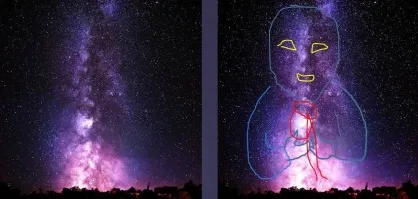 Обведенная мною кормилица держит в руках чашу, из которой льётся свет. Изображение подобно скальным и мегалитическим.