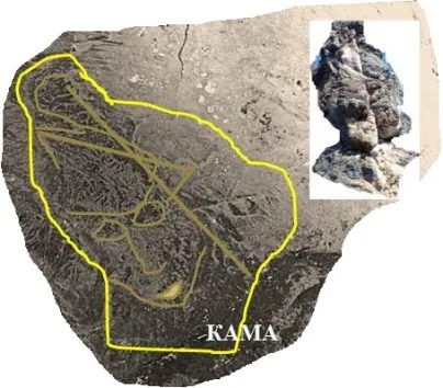 Кроме изображений лиц, видим выбитые буквы: «Раса аса. Ра (солнце) аса. Ось вои (воина) Рами (ы). Храм – гора. Трон – Кама». И снова Кама! Кроме названия реки, Кама переводится как оружие, верблюд, японский серп (Викисловарь), кольцо, окружать с татарского (сайт Classes.ru). Голова воина со стрелой от виска до шлема видна на правой верхней части скал и соответствует изображению на рельефе России в районе реки Кама (рисунок автора):