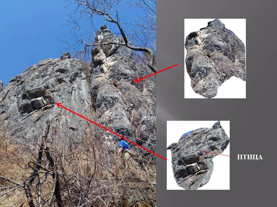 На этой скале уже выбиты или вылиты из древнего бетона лицо человека, морда льва, медведя и птица на подставе из квадратных блоков. Изображения выбиты слитно, поэтому, чтобы их различить, надо скалу рассматривать:
