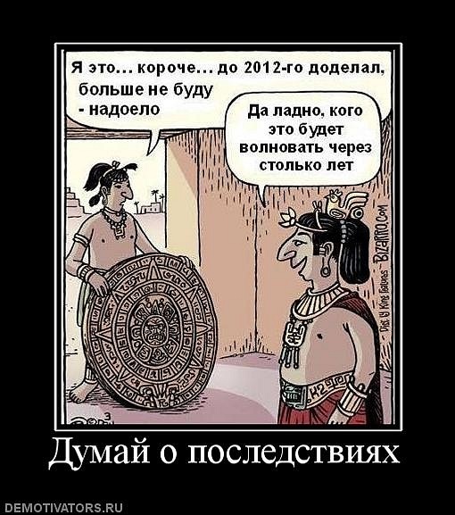 А в 2012 все будет хорошо, я проживу до 47 лет, а в 2012 мне будет 29, так что конца света точно не будет. Но я не против изменений, пусть даже умрут 3 миллиарда человек, главное что бы были изменения на нашей планете, которые постигнут человечество пойти по другому пути.