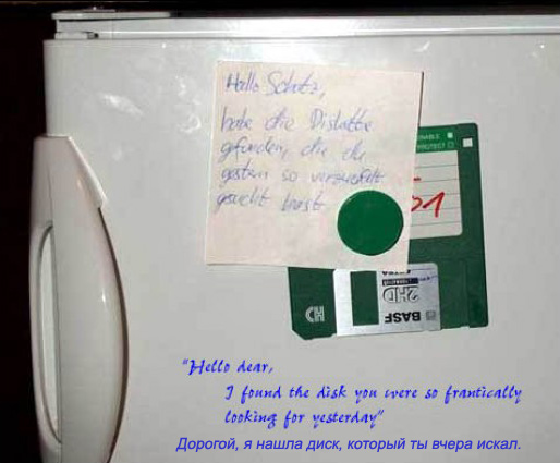 [spoiler:3q4i6z68]отгадал Angel: девушка подумала, что прижать дискету магнитом к холодильнику — хорошая идея. на самом деле плохая, так как магнит её размагнитил и все данные пропали[/spoiler:3q4i6z68]